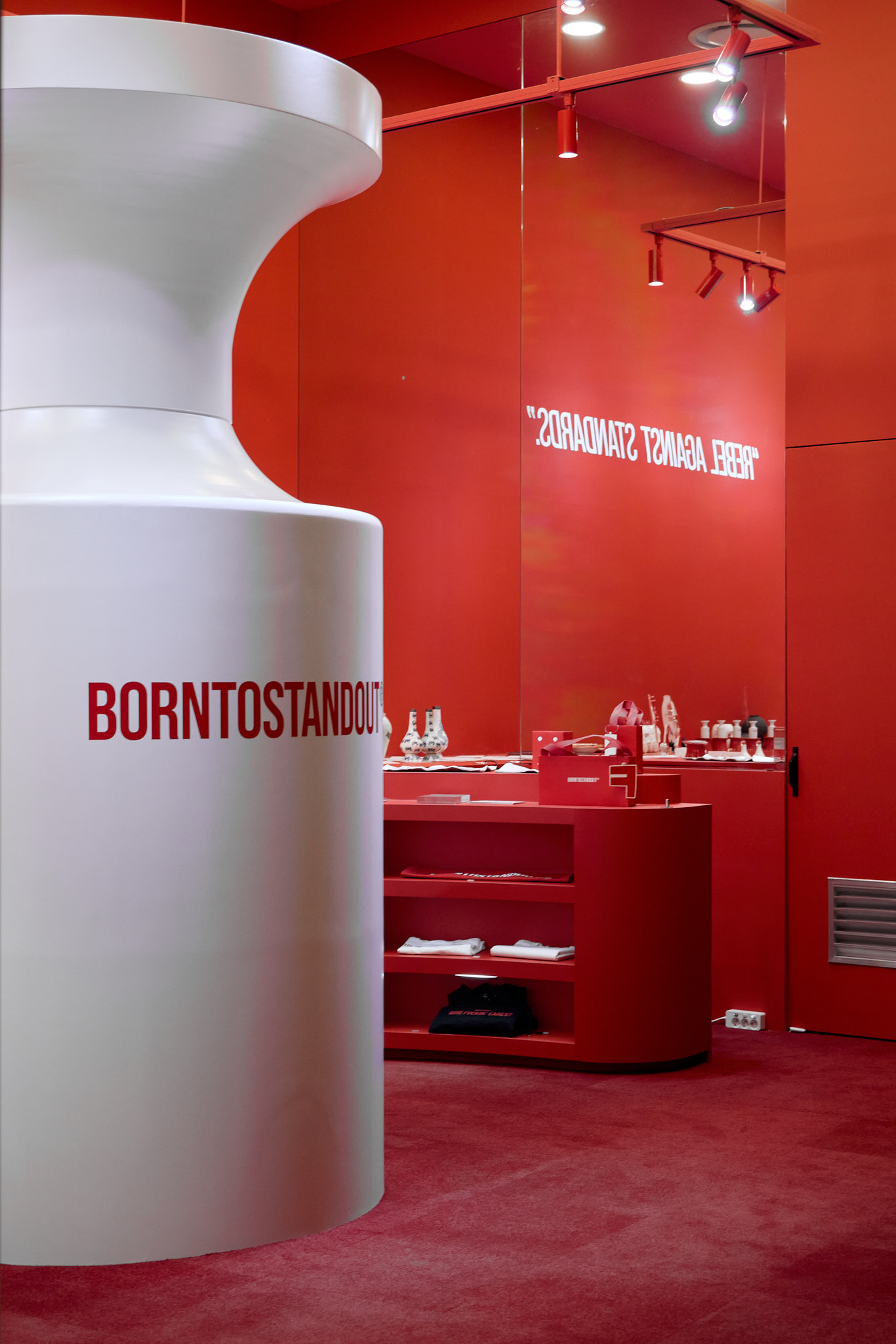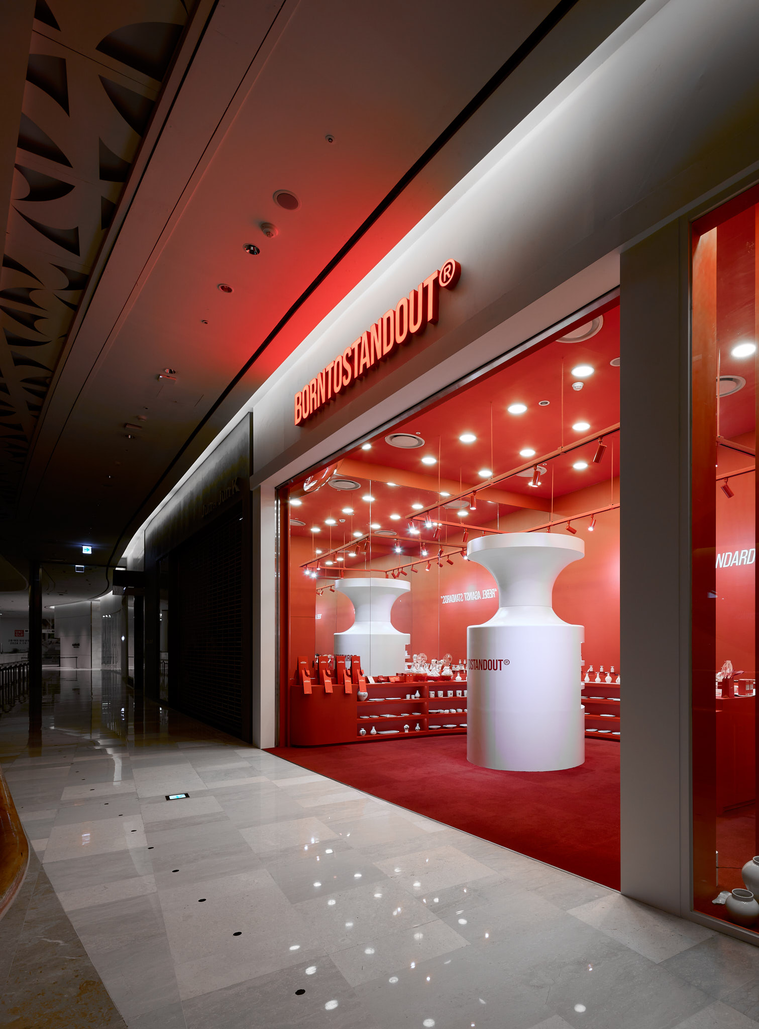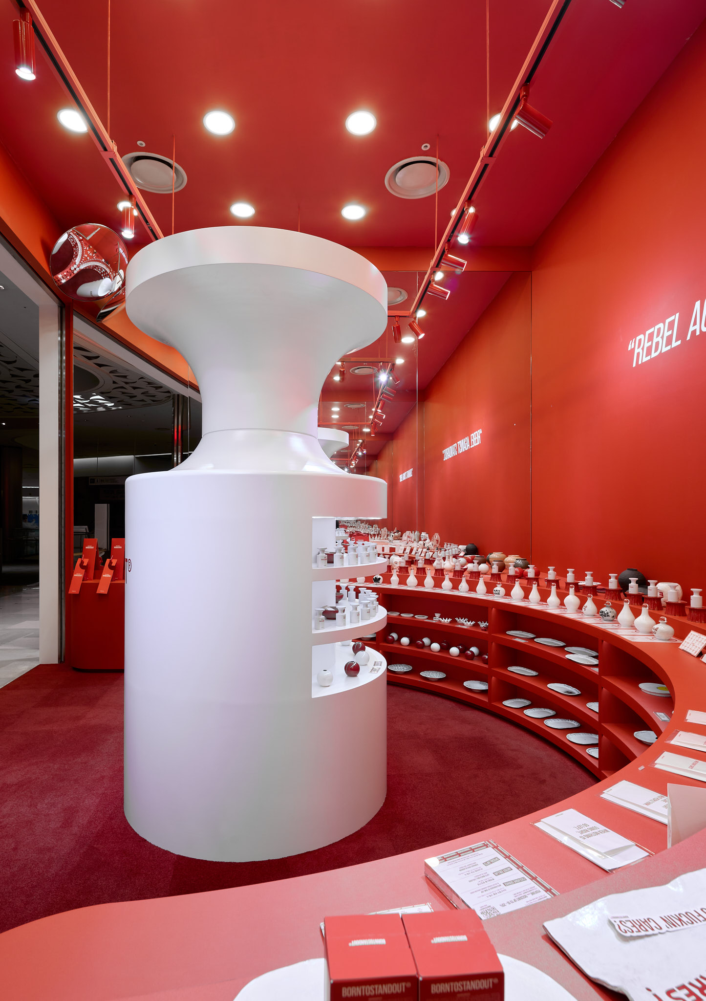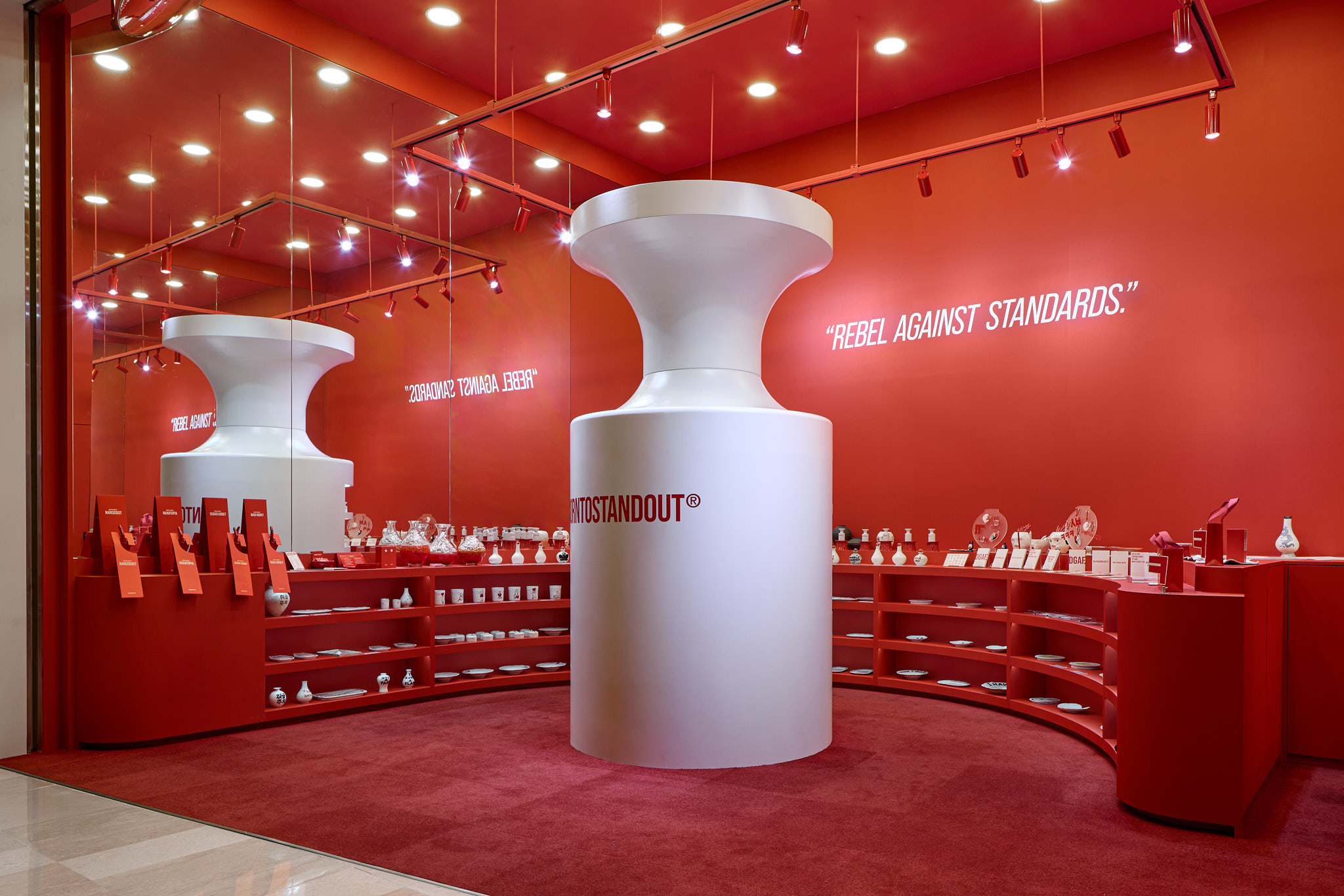 판매할 제품 외에 모든 요소를 붉게 물들이고 있는 현장이다. 기존 백화점 스포트라이트 조명(블랙)도 제거하고, 우리 브랜드의 키컬러에 맞추어 커스텀 제작. 이게 되네?