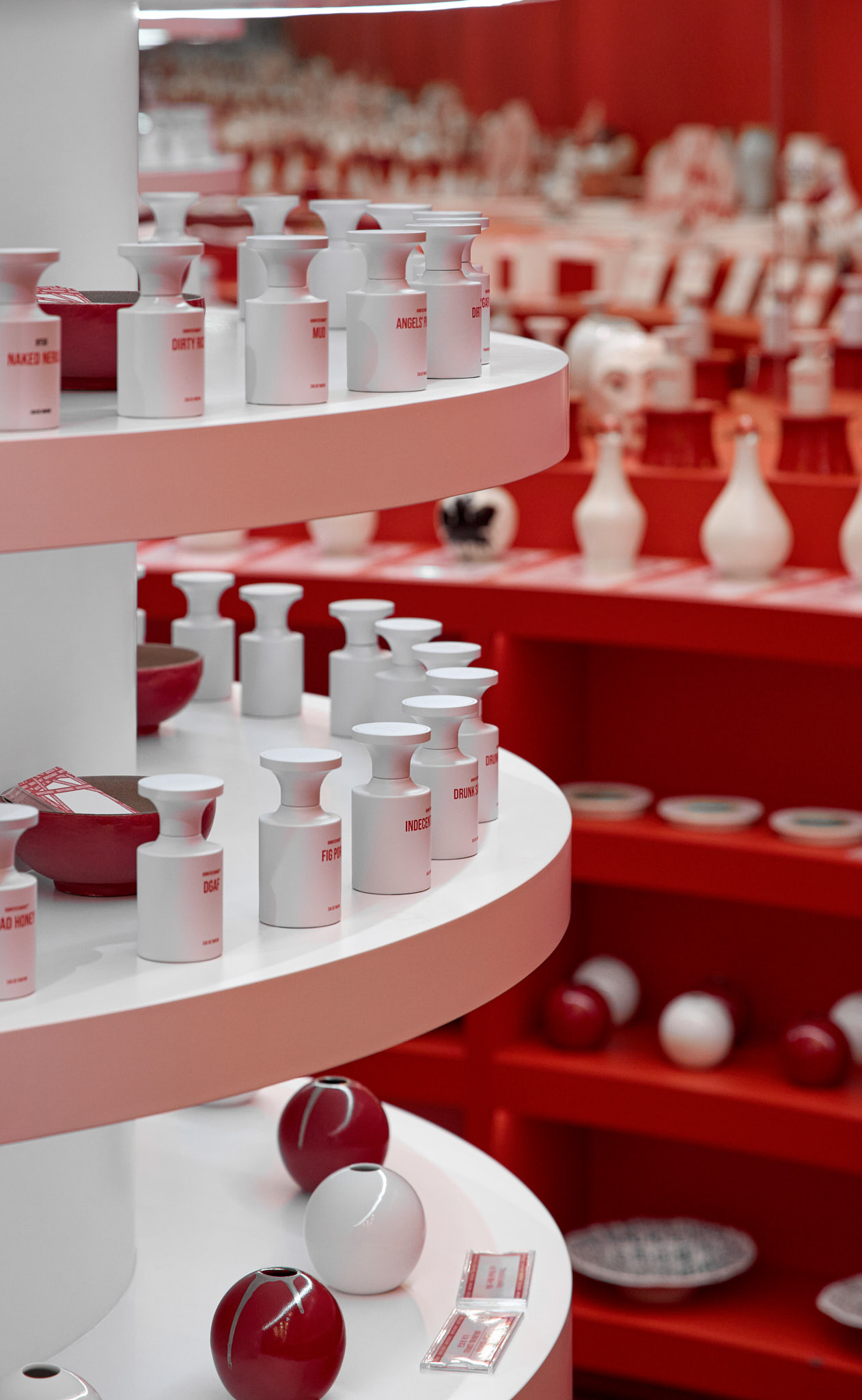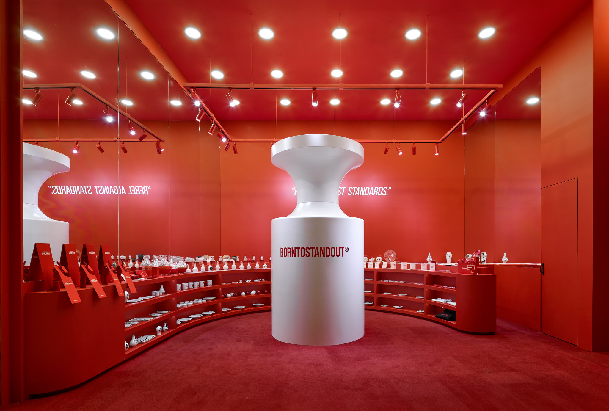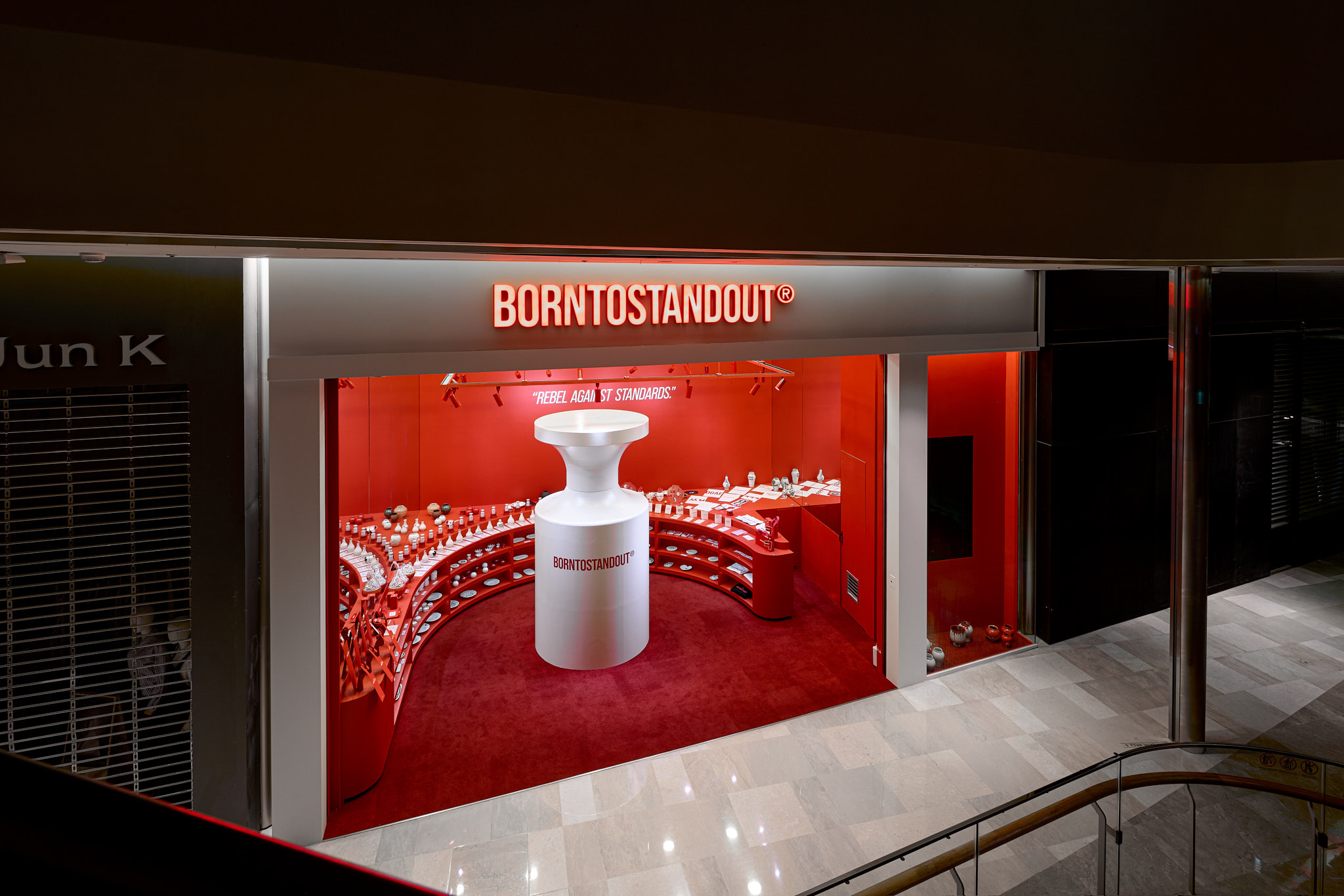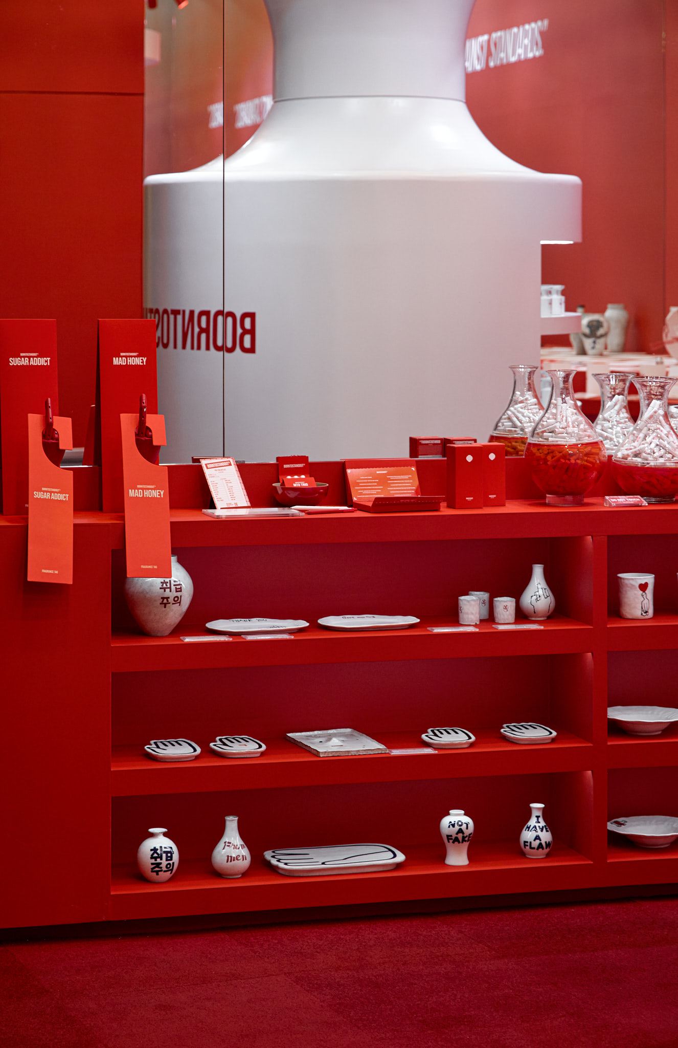 판매할 제품 외에 모든 요소를 붉게 물들이고 있는 현장이다. 기존 백화점 스포트라이트 조명(블랙)도 제거하고, 우리 브랜드의 키컬러에 맞추어 커스텀 제작. 이게 되네?