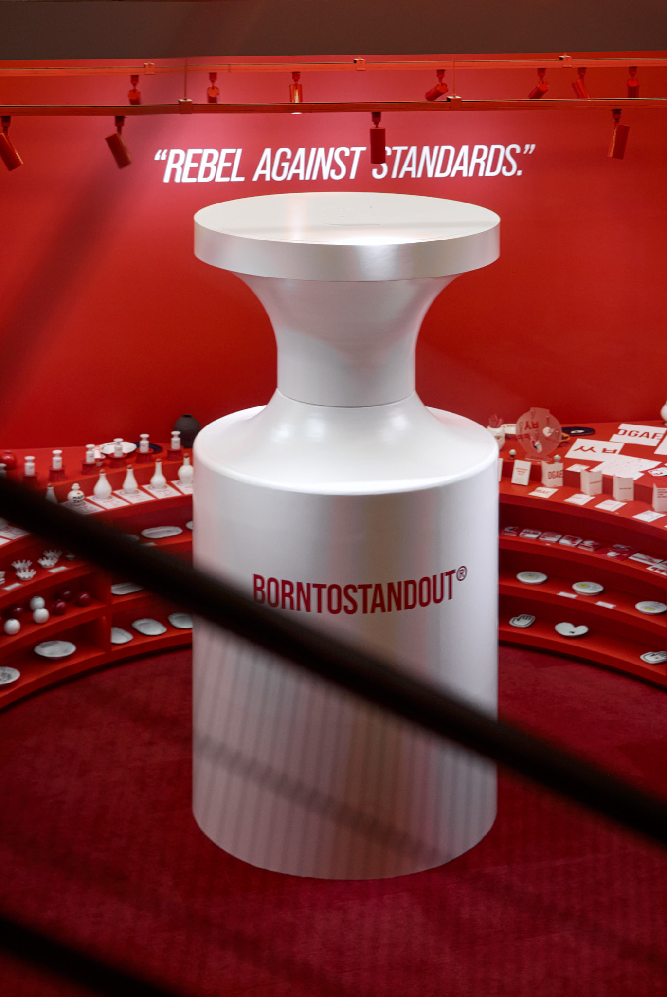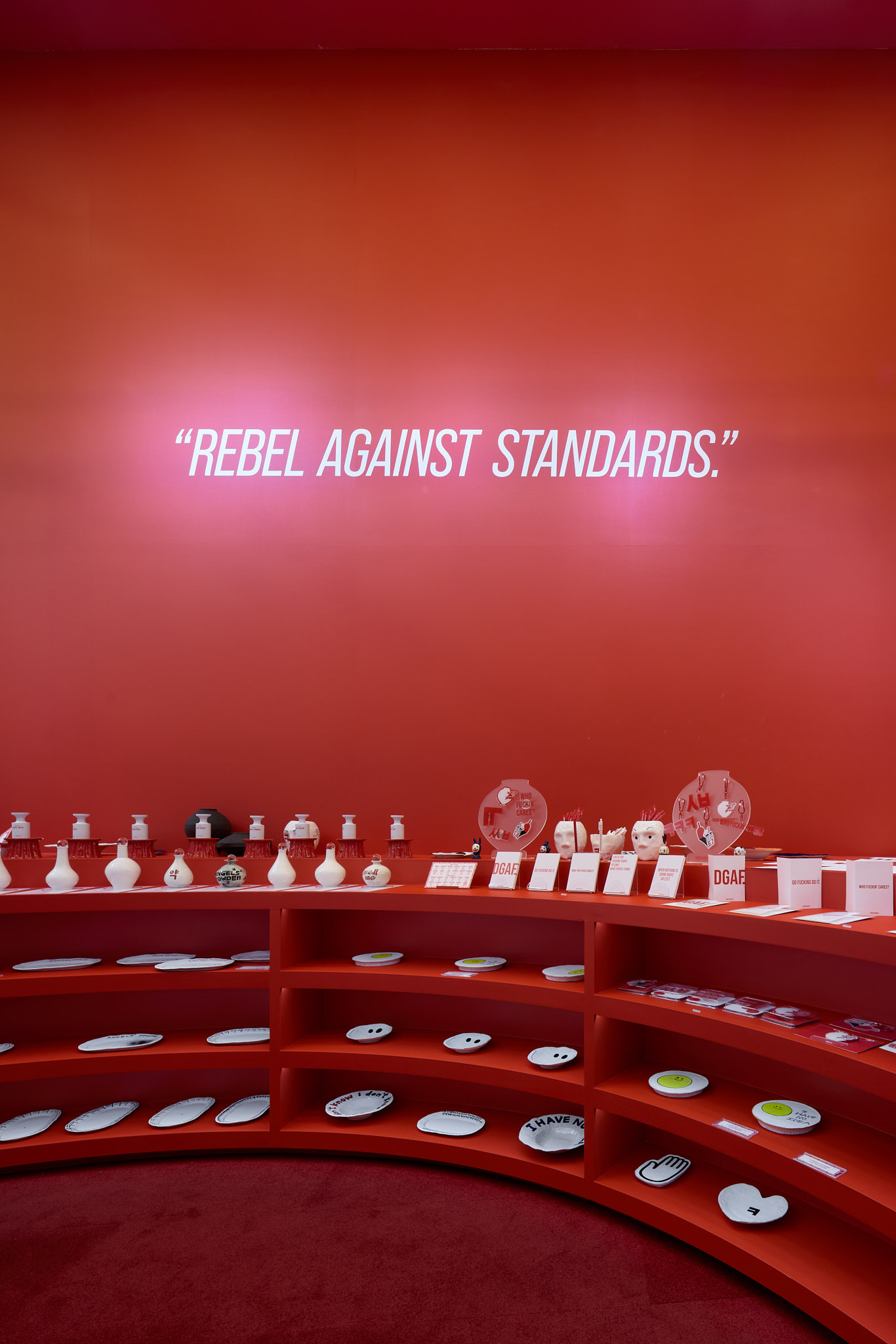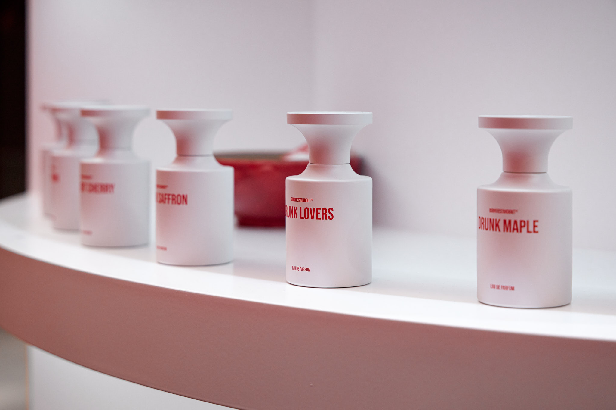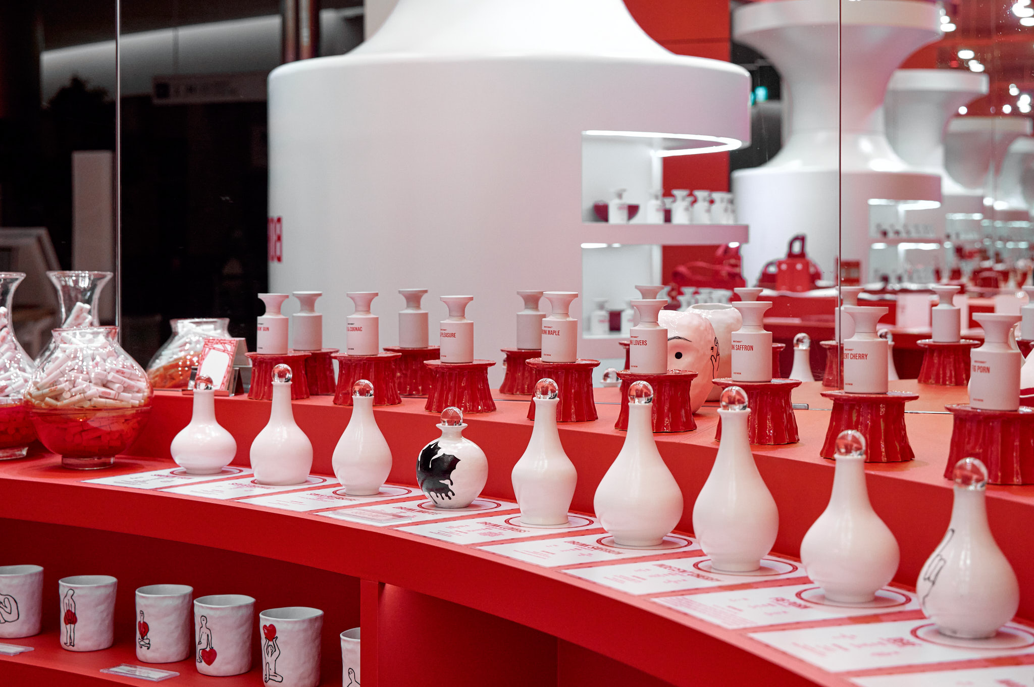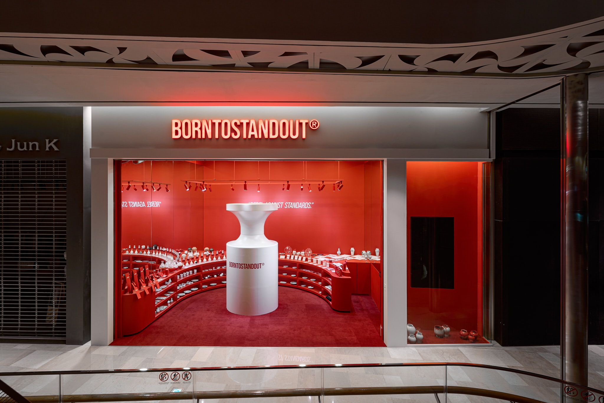 판매할 제품 외에 모든 요소를 붉게 물들이고 있는 현장이다. 기존 백화점 스포트라이트 조명(블랙)도 제거하고, 우리 브랜드의 키컬러에 맞추어 커스텀 제작. 이게 되네?