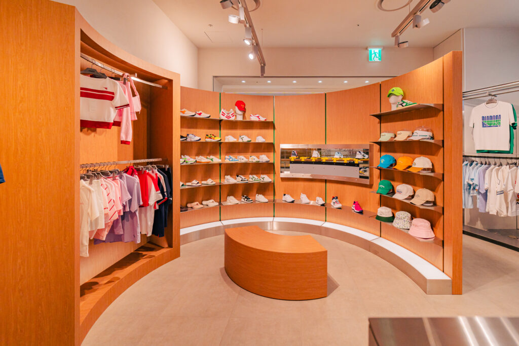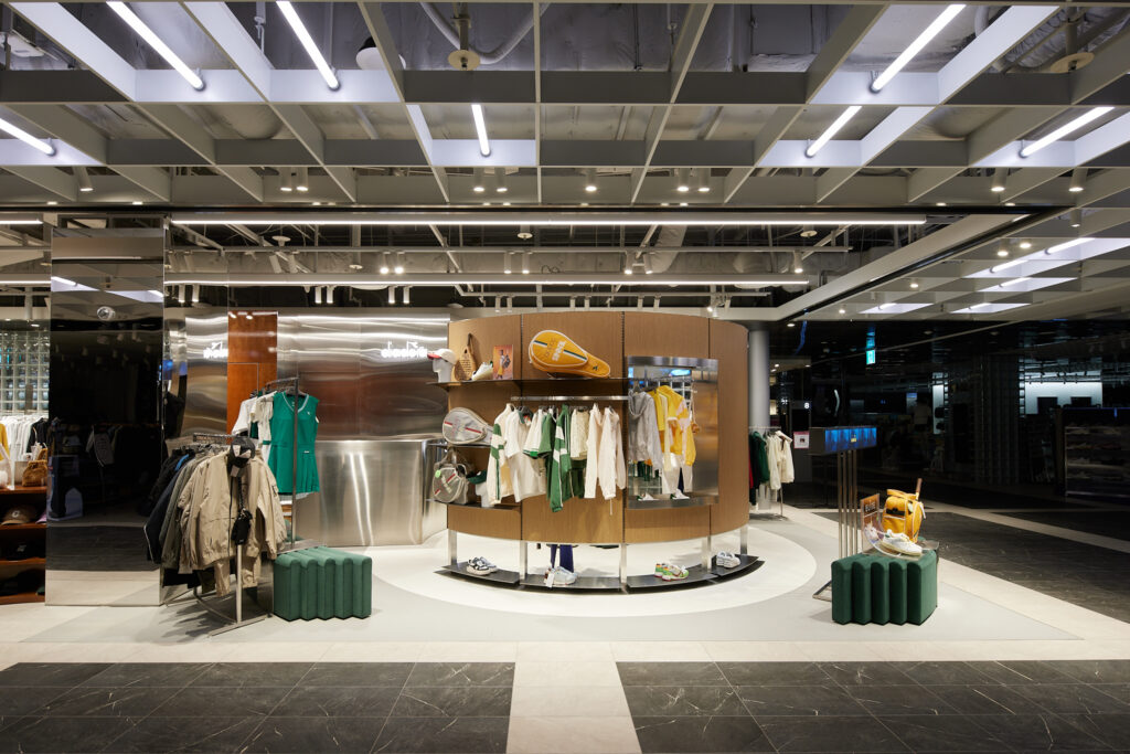 '디아도라, 테니스, 우먼스’ 라는 키워드를 나열하면, 디아도라 테니스 라인을 소비하는 여성의 프라이빗한 공간이 떠오릅니다. 충분한 구매력을 갖춘 신세계 강남점에서 이를 재현하고자 하였습니다. 스틸과 우드로 비주얼의 톤앤매너를 유지하되, 우먼스 특화 매장인 만큼 제품 항목별 단순 열거방식이 아닌 큐레이팅된 착장을 디스플레이하는 방식을 제안하였습니다. 아일랜드형 배치임에도 불구하고 고객 입장에서 프라이빗한 경험을 할 수 있도록 동선을 조직한 것이 특징입니다.