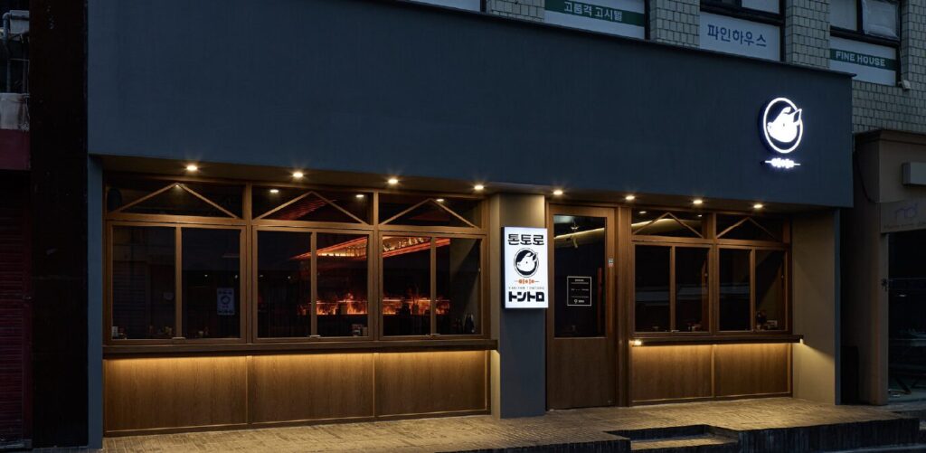 지붕이라는 공간요소, 돼지고기라는 국민메뉴, 익숙한 돼지고기 익는 냄새까지. 보편적인, 평범하고 익숙한것들이 모여서 주는 적당한 근사함이 매력적인 공간입니다. 공간에 들어서면 눈길을 사로잡는 바테이블의 화염 디스플레이를 톤토로만의 강력한 시그니처 포인트로 제안하였습니다. 돼지고기 특수부위를 주력으로 하는 전문성이 드러날 수 있도록 주인장이 직접 고기를 굽는 중앙 화로대를 과감히 노출시키고, 채도가 낮은 우드톤으로 캐쥬얼하고 편안한 공간을 구성하였습니다.